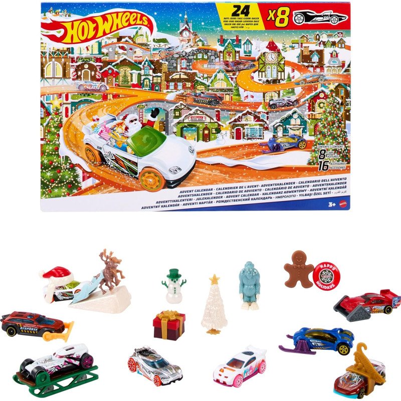Протягом 24 днів відкривайте одне з відділень, щоб виявити сюрприз. Кожен календар містить 8 автомобілів Hot Wheels у масштабі 1:64 і 16 зимових аксесуарів, як-от снігоочисник або дерево.