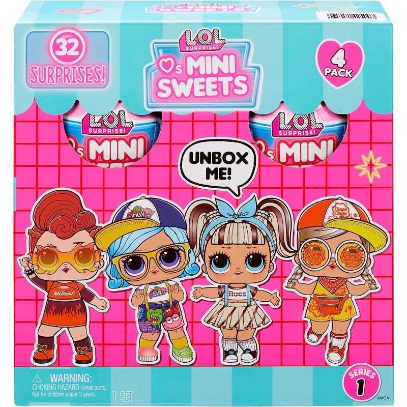 • UNBOX 32 SURPRISES, щоб відкрити всі способи гри: (1) 4 ляльки LOL Surprise Loves Mini Sweets в упаковці з паперовими кульками; (2) 4 наряди; (3) 4 пари взуття; (4) 4 пляшки; (5) 8 аксесуарів Mix & Match; (6) 4 гаманці; (7) 4 наклейки.