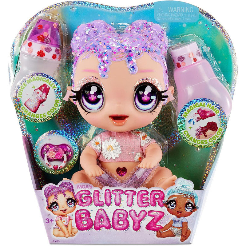 • SPARKLY BABY DOLL: стежте за блиском у захід сонця, поверніть ліворуч на місяць, і ви відкриєте для себе чарівний світ Glitter Babyz. Glitter Babyz — блискучі, красиві, чарівні малюки з великими гарними очима, блискучими віями та блиском у волоссі.