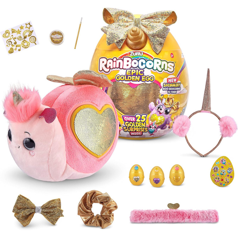 • RAINBOCORNS EPIC GOLDEN EGG: відкрийте для себе найдивовижніші блискучі золоті сюрпризи з Rainbocorns EPIC Golden Egg! Вилупіть гігантське яйце, щоб відкрити НОВИЙ Rainbocorn. Розпакуйте понад 25 шарів золотих сюрпризів, включаючи всі НОВІ Boo-boocorns, аксесуари для волосся та блиск! Це ідеальний різдвяний подарунок із епічним сюрпризом розпакування.